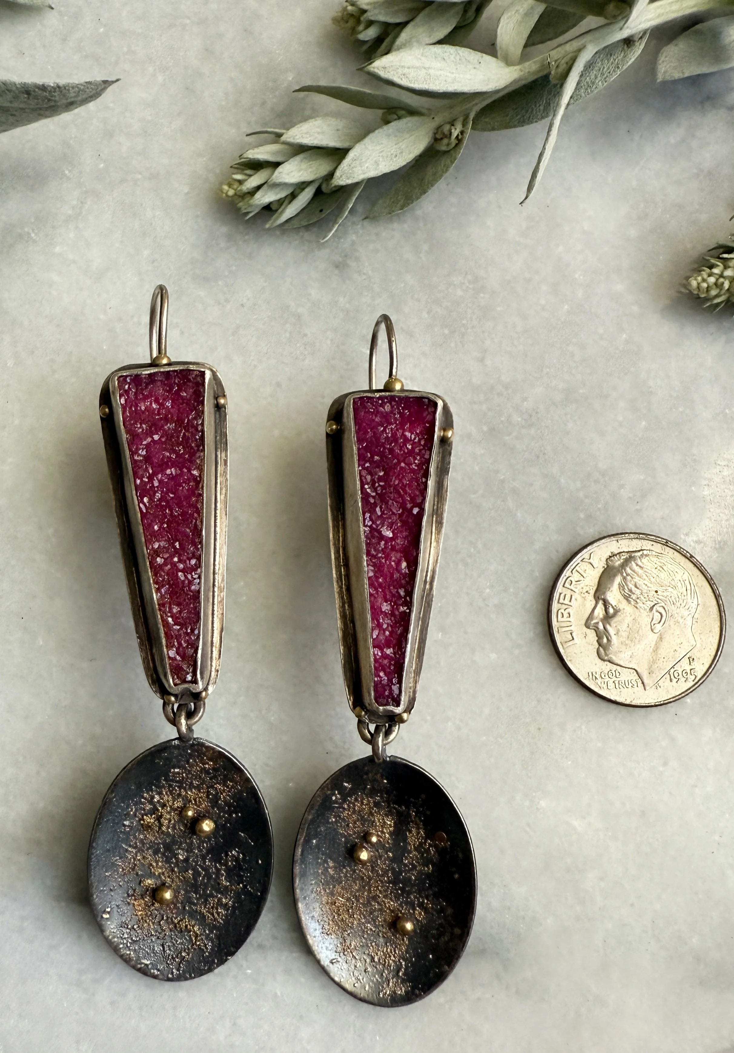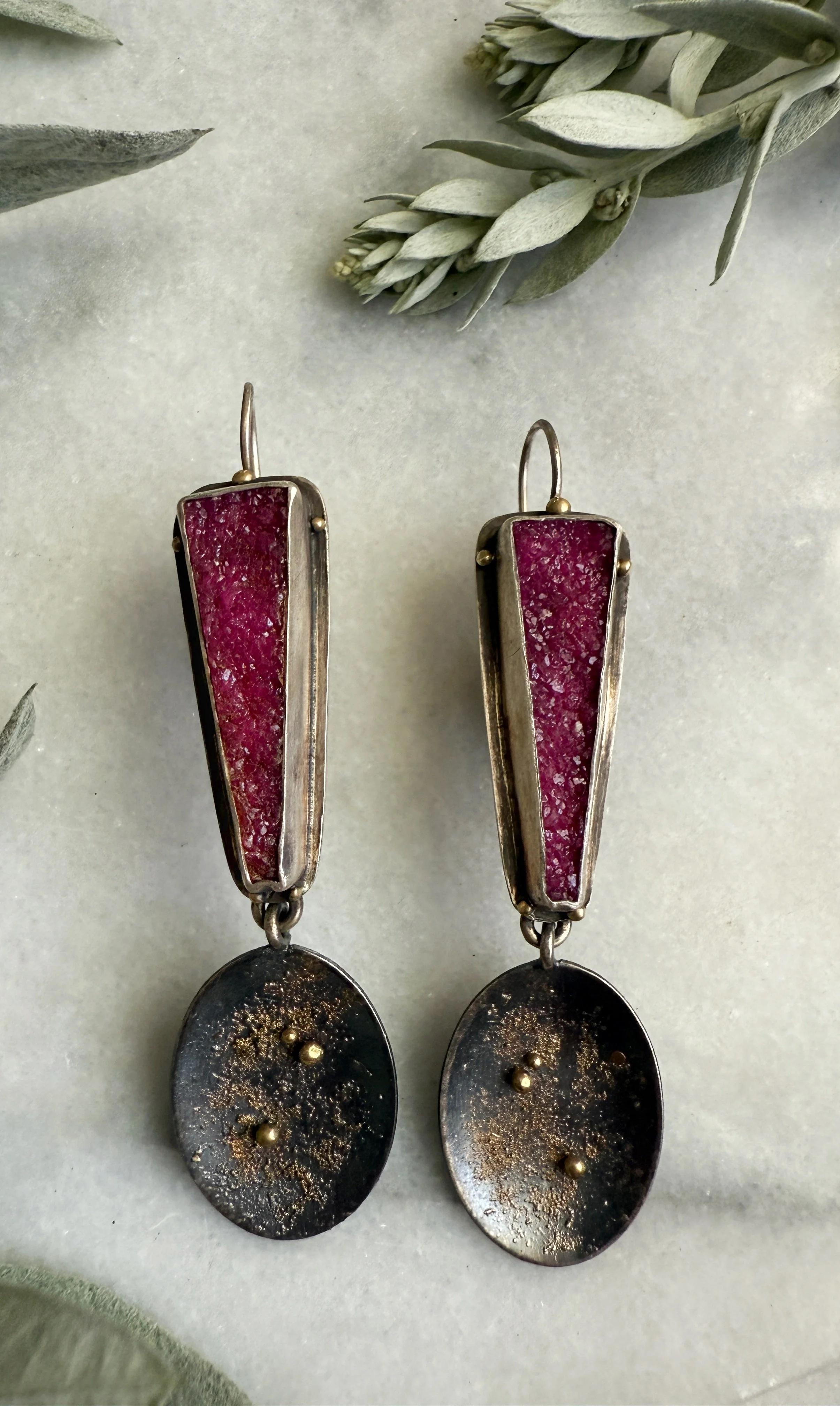 Natural pink cobalto calcite druzy stones have silver ovals sprinkled with 18k yellow gold dust and baubles. The gold shimmers on the oxidized silver and gives an otherworldly ancient look. Approx 2 1/4 inches long with sterling French ear wires.