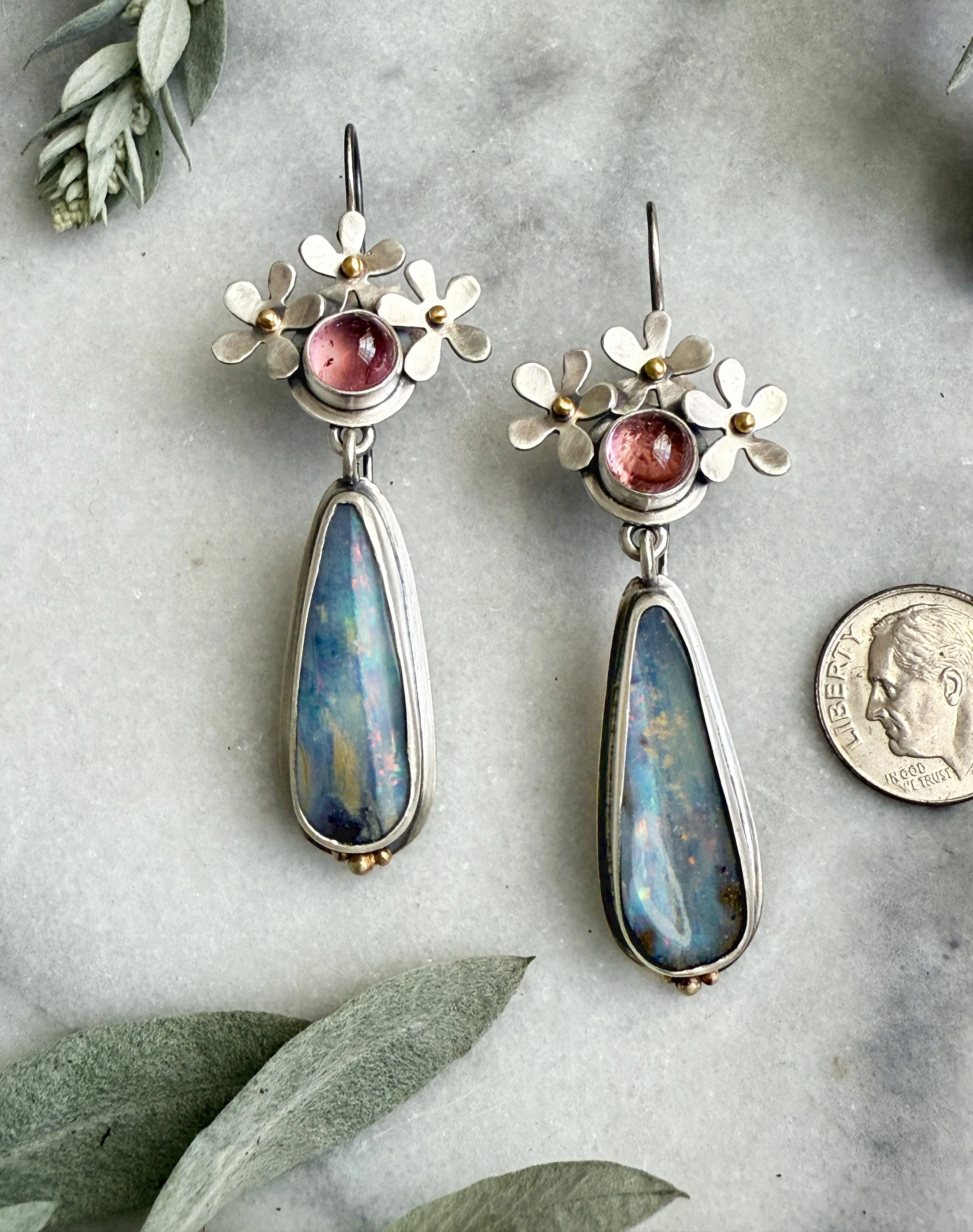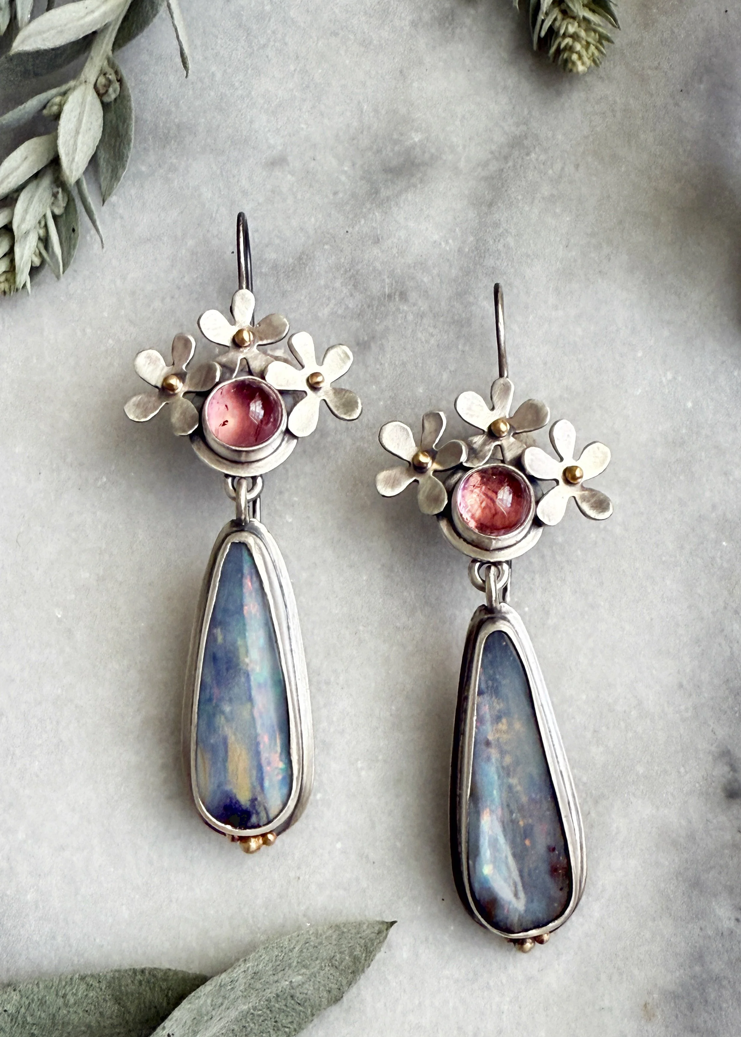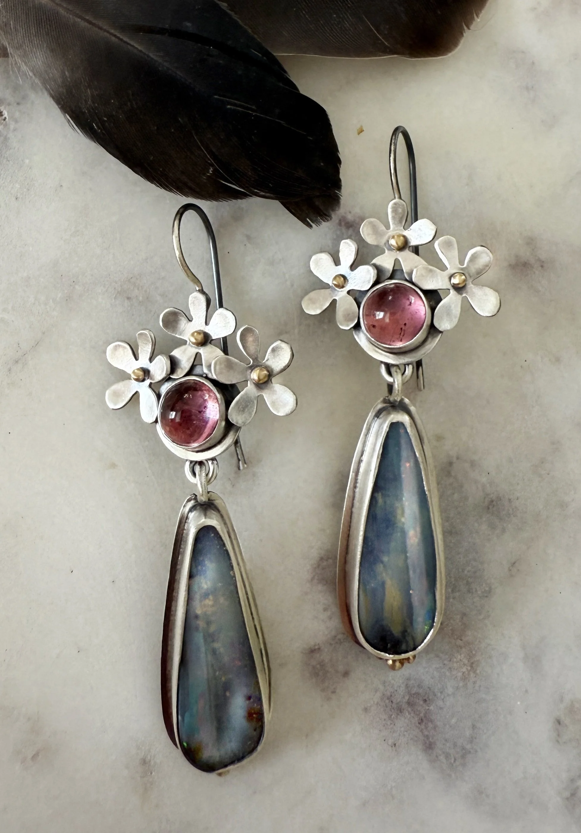 Sterling silver daisy earrings with round pink tourmalines and boulder opal drops. Translucent pink stones are bezeled in fine silver and topped with sterling daisies with 18k yellow gold centers. Blue with white and hits of pink flash, these elongated boulder opals shine and complement the pink above. Sterling french ear wires make these earrings comfortable to wear. Approximately 2 ½ inches long by 1 inch wide.