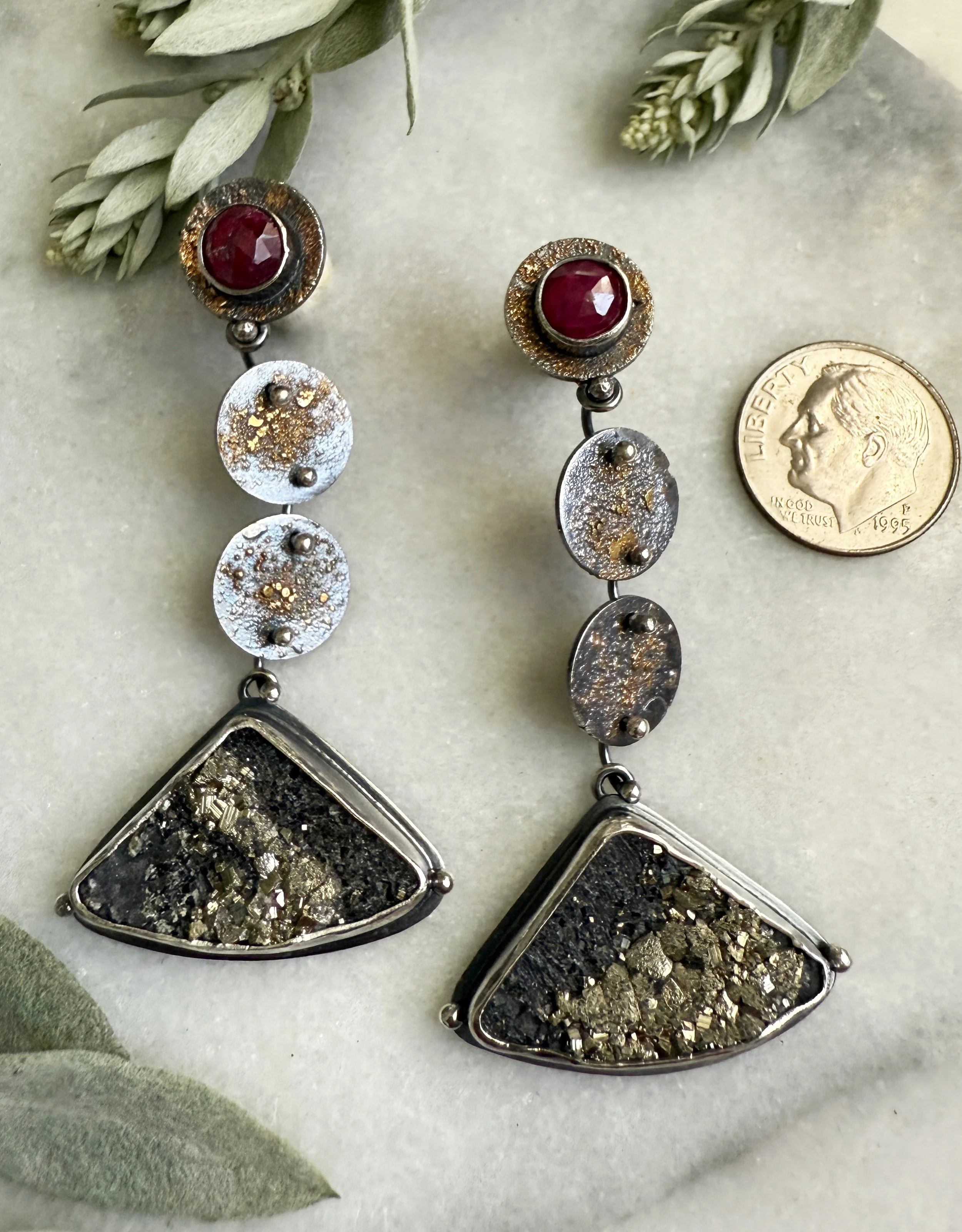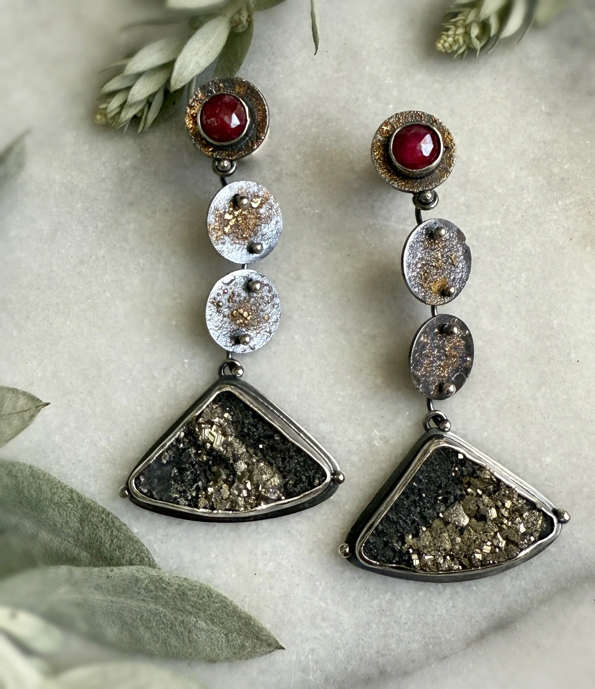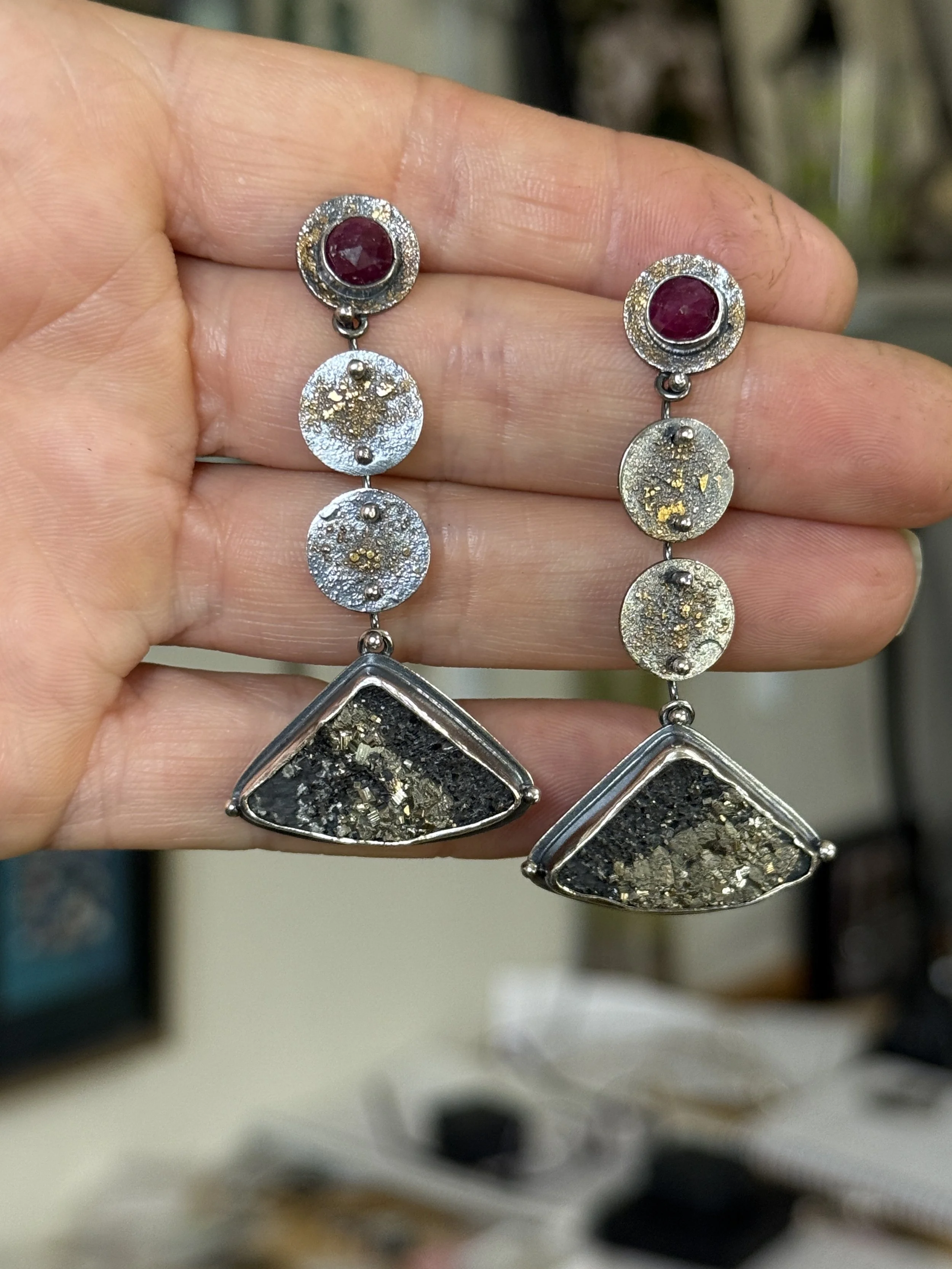 Oxidized silver with fused 18k yellow gold dust, rose cut rubies and pyrite in slate stones. 6mm red ruby rose cut stones are bezeled in fine silver and have gold dusted discs dangling below with a triangular pyrite in slate raw cabochon below. Contemporary and ancient feeling at the same time. Articulated movement allows the earrings to wiggle while comfortably hanging from your ears. Sterling stud backs hold the ruby tight on your ear. Approximately 2 3/8 inches long by 1 inch wide. Handmade and artist signed.