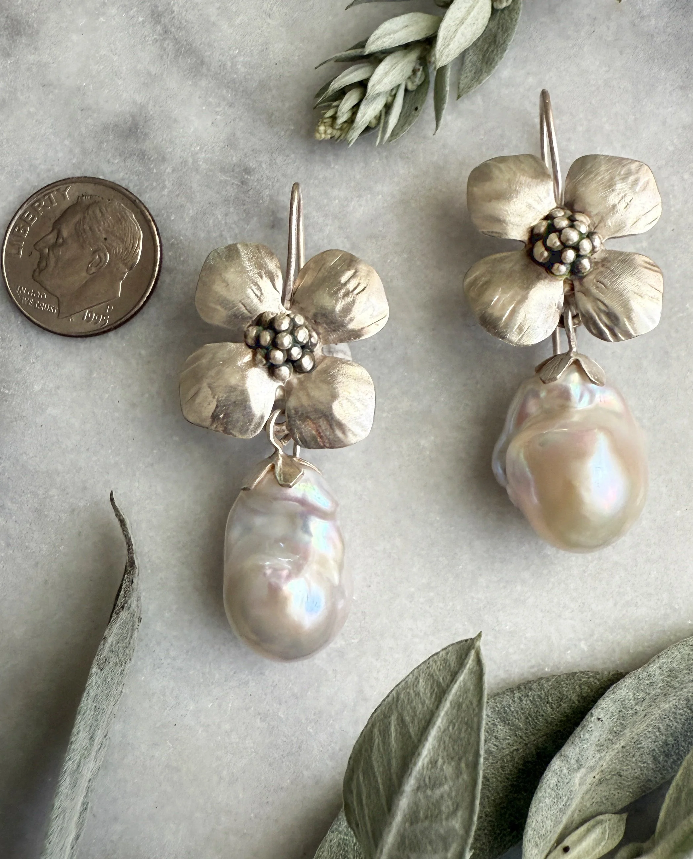 Sterling dogwood flowers with large freshwater pearl drop. Tiny silver flowers cap the lustrous fireball pearls and dangles it from the textured flower. Approximately 2 inches long by 1” wide. Sterling French earwires.
