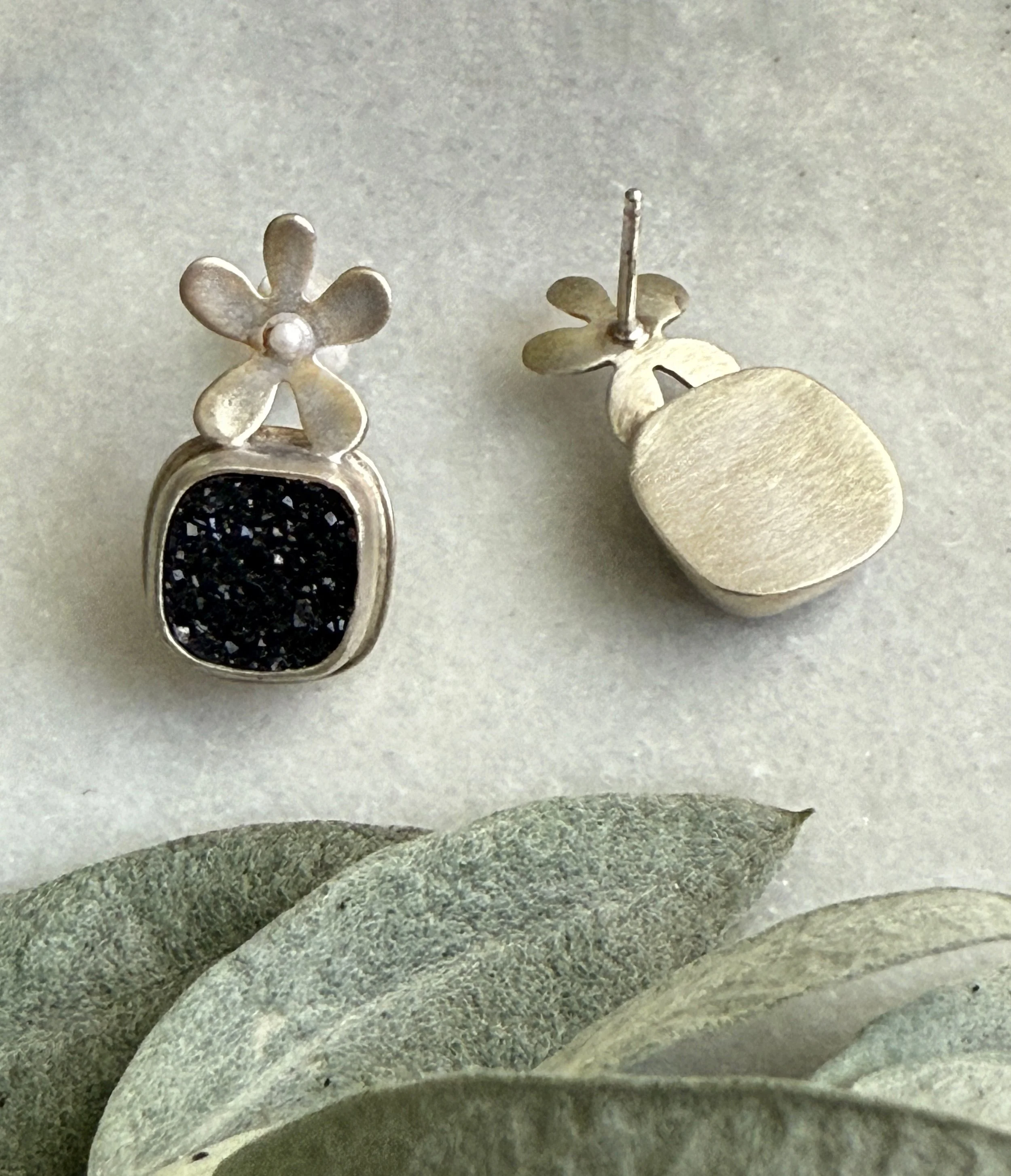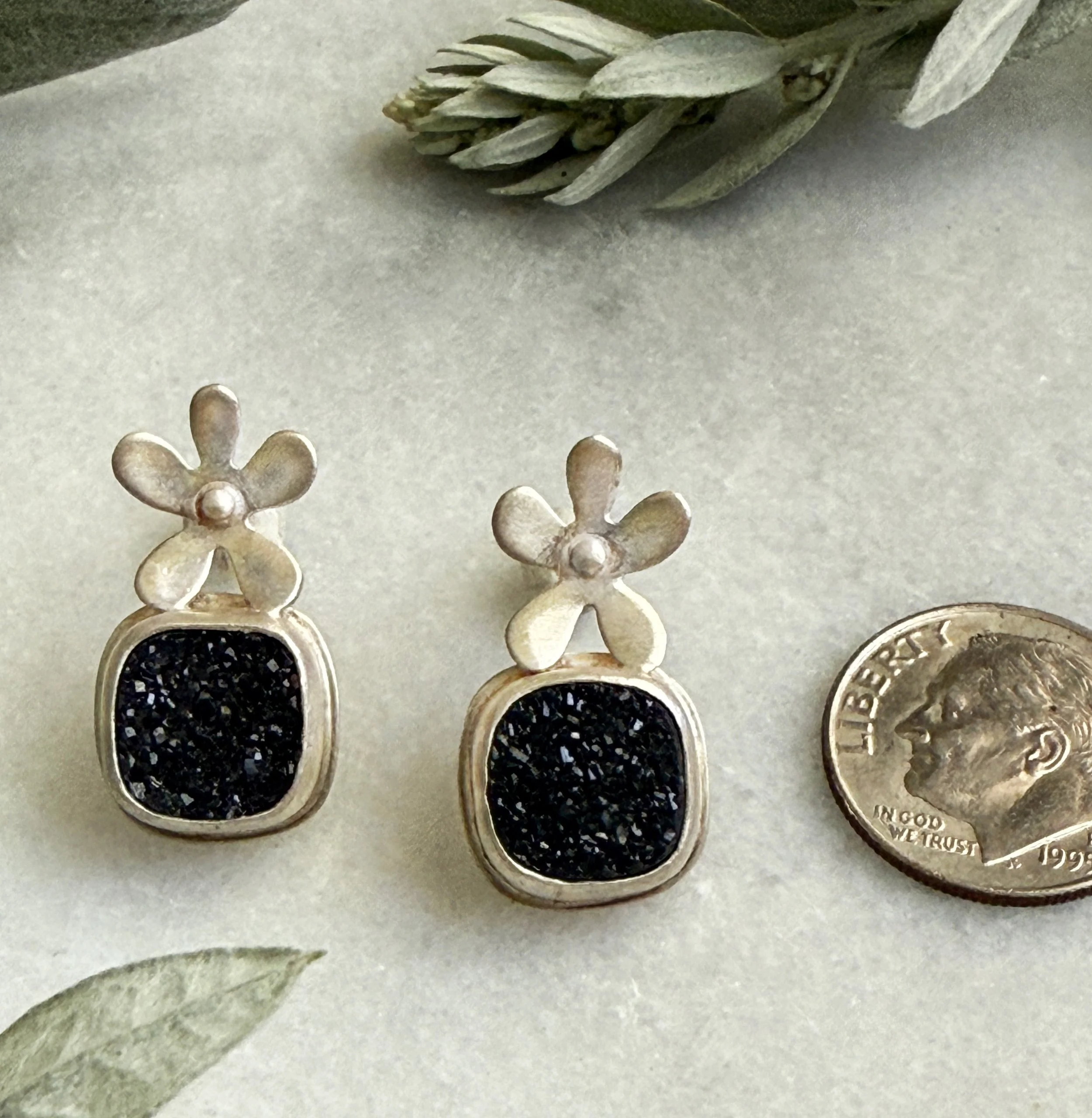 Sterling silver daisy sits above a natural black agate druzy stone. Classic design is easy to wear with a stud back. Brushed silver finish allows the sparkly stone to shine. Approximately 1 inch long by ½ inch wide.