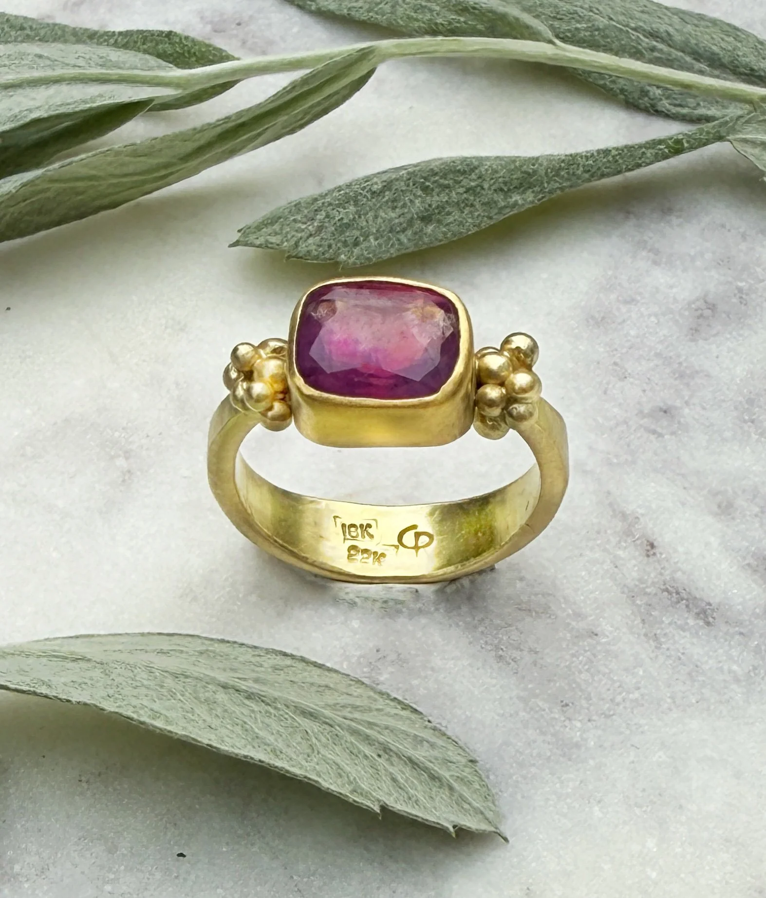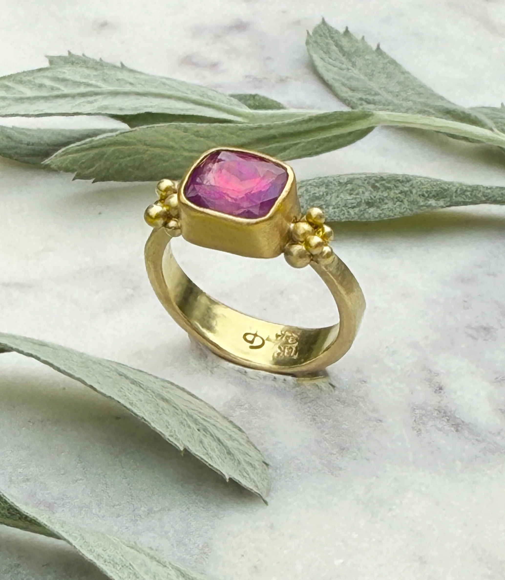 18k royal yellow gold ring with natural hot pink silky sapphire. 22k yellow gold bezel surrounds this amazing unheated 3.12 ct gemstone. 18k baubles and forged ring shank make for a comfortable fit on the finger. Brushed satin finish. Size 6 ¼
