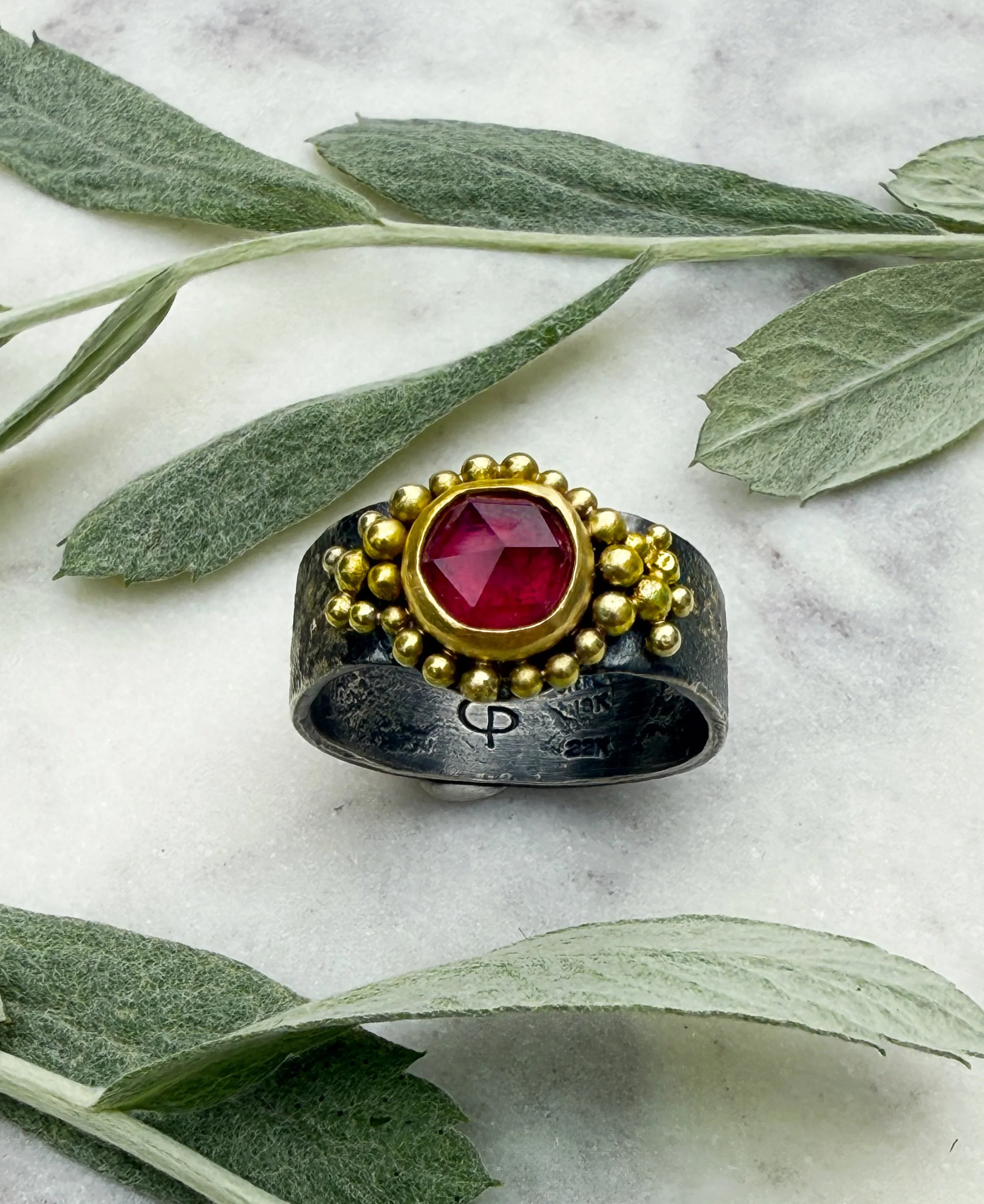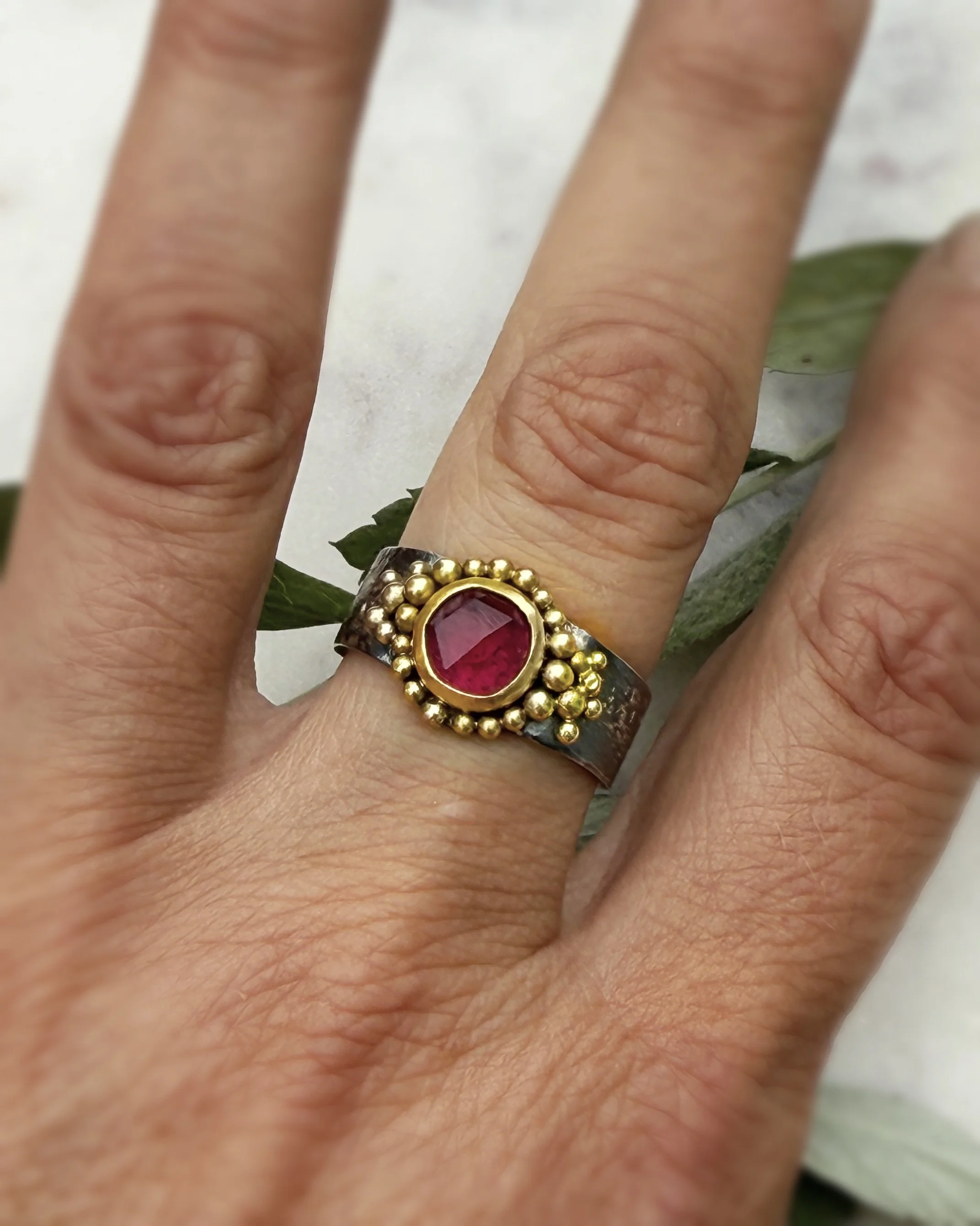 Oxidized sterling silver ring shank has gold dust fused to the surface. 18k baubles surround the 22k bezeled pink tourmaline. This amazing deep pink glows amongst the warm gold and darkened silver. The rose cut tourmaline is just about 8mm round and is faceted on the top to enhance the beauty. This ring is comfortable on the finger with the shank tapering in the back. Size 8 ½.