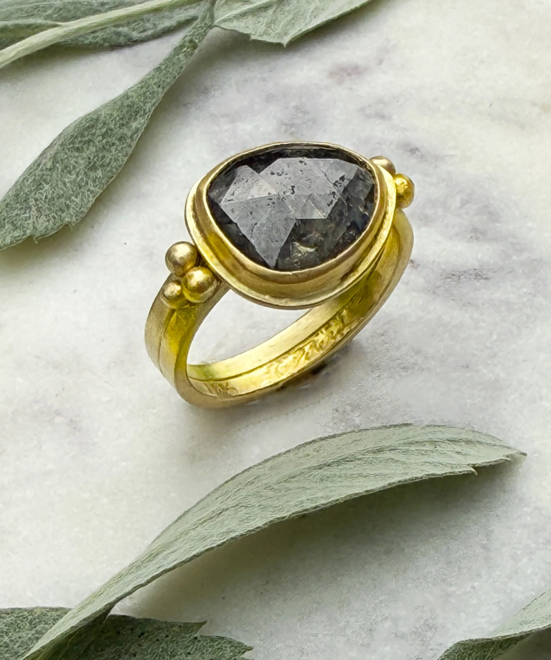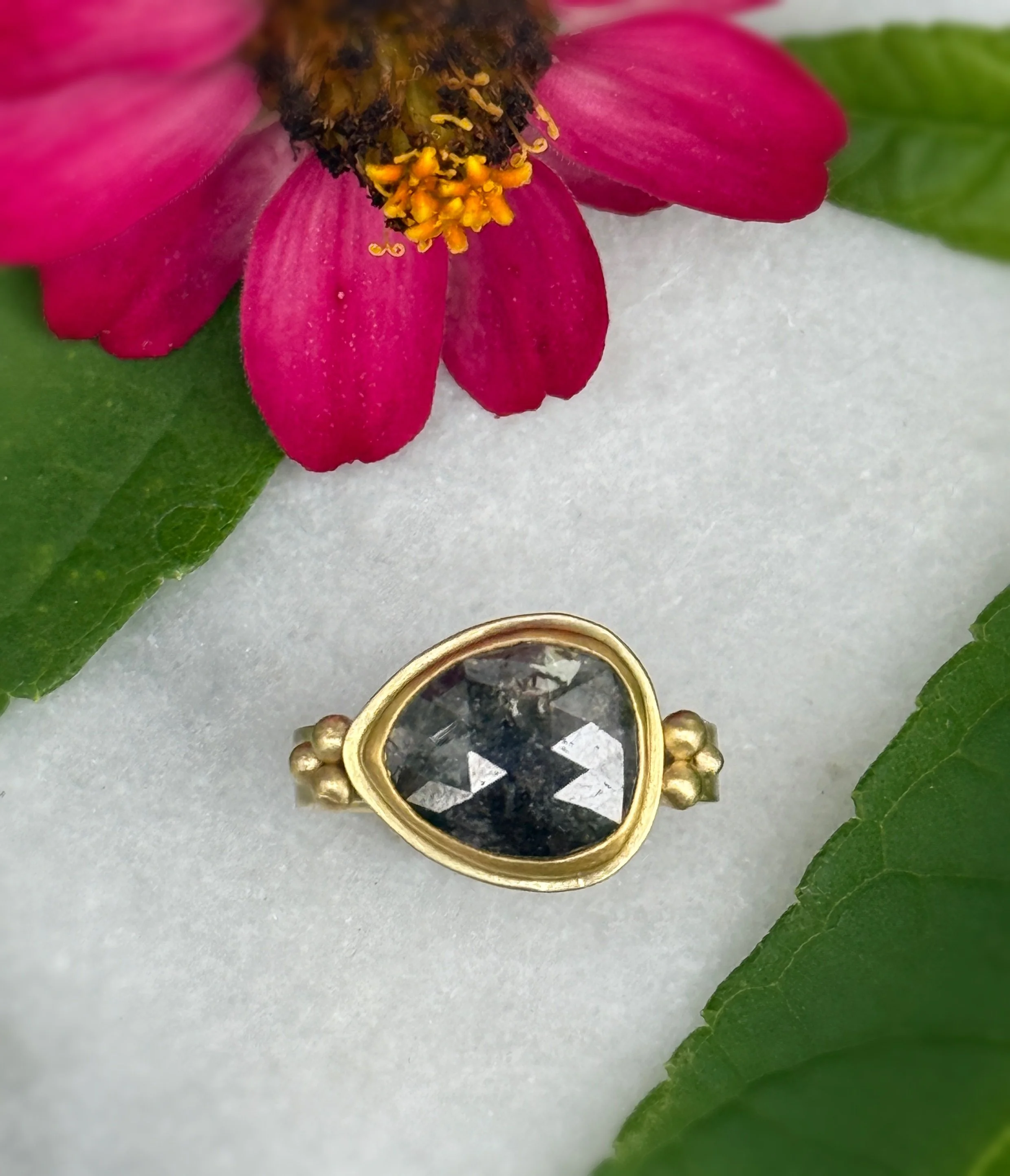 Yellow gold ring with 5.12 ct rose cut diamond. 22k gold surrounds this sparkly gray salt and pepper diamond. 18k royal yellow golden ring and baubles add a clean and classic finish. Size 8 ½. Could be sized up or down by 1 size.