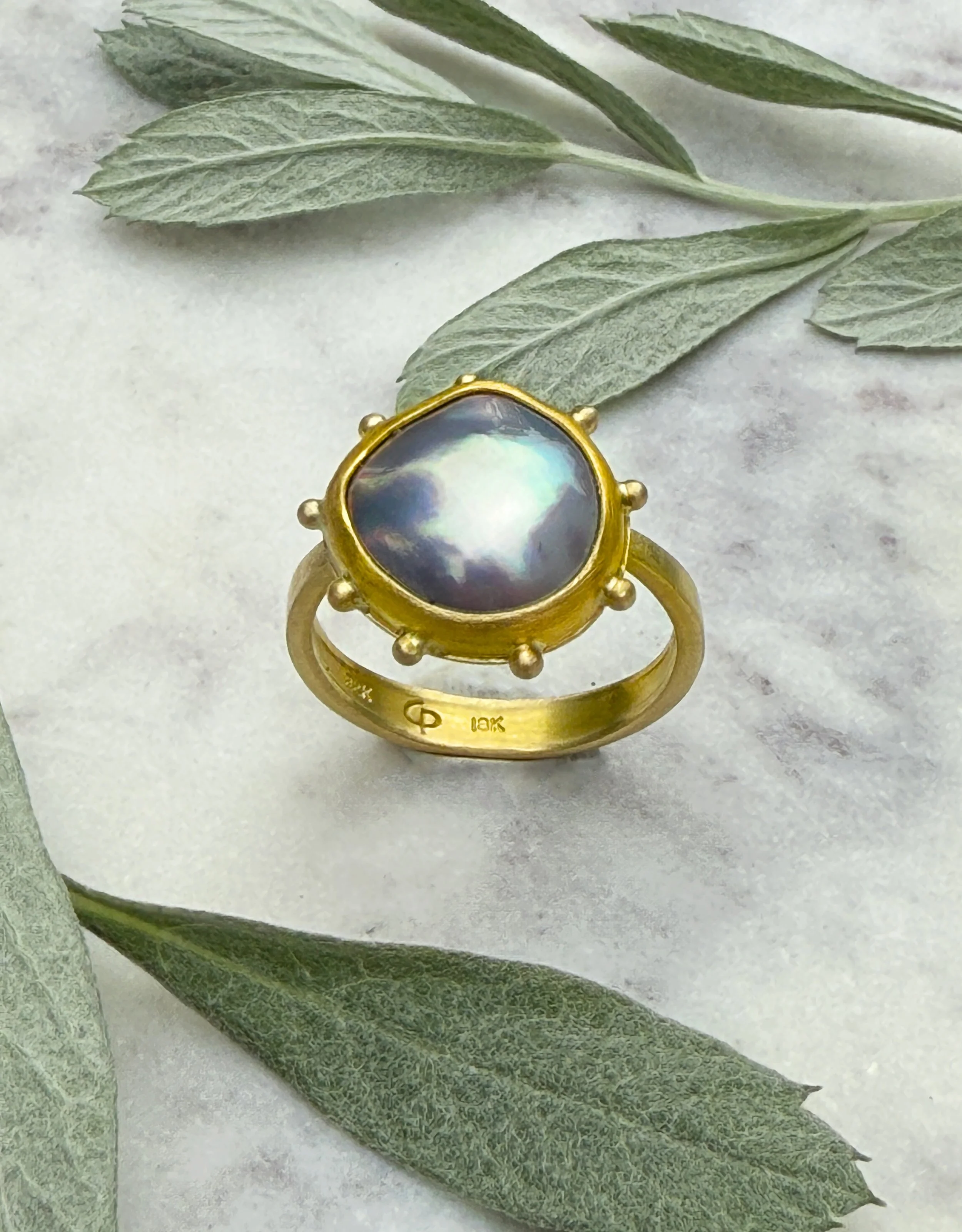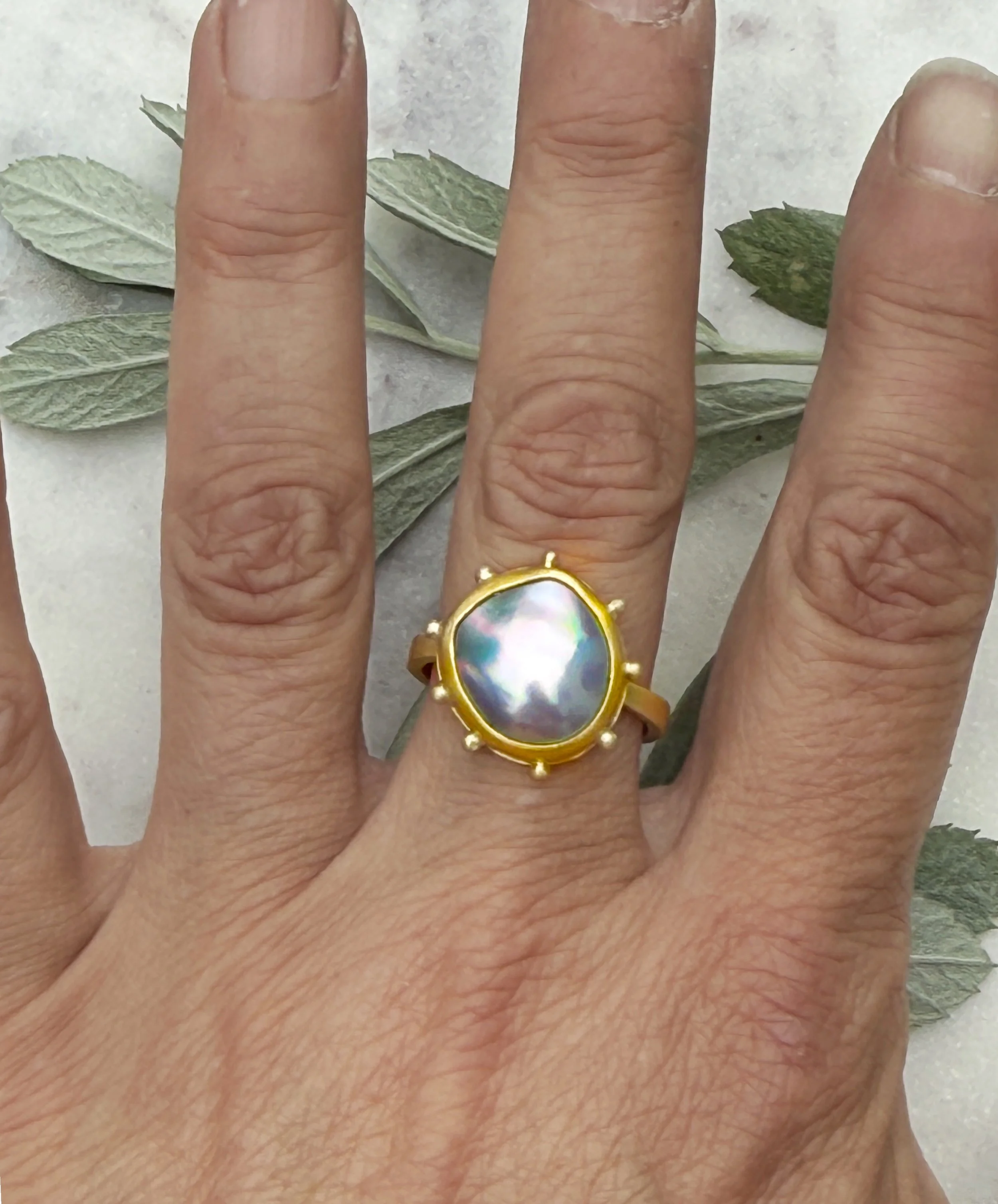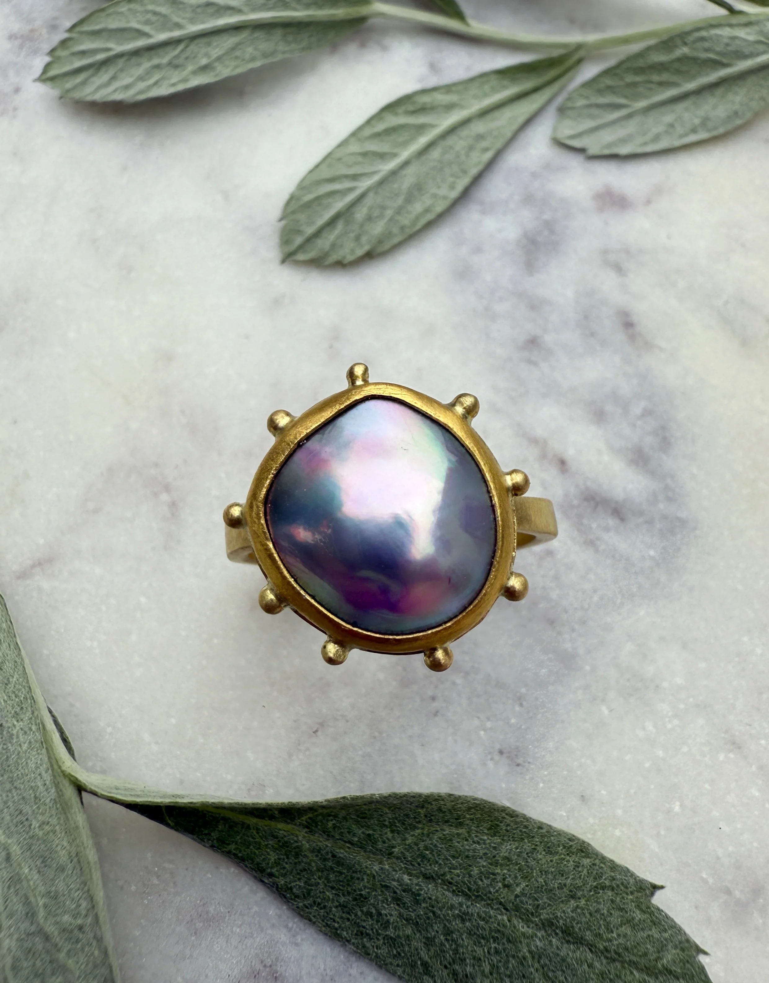Amazing natural Sea of Cortez mabe pearl ring. Warm 22k yellow gold surrounds this lustrous beauty, with 18k gold ring and baubles. Purples, pinks, and smokey grays dance along the pearl’s surface for a striking one of a kind ring. Pearl measures 16mm high by 16mm wide. Ring size 9. Possible to size—reach out and ask.