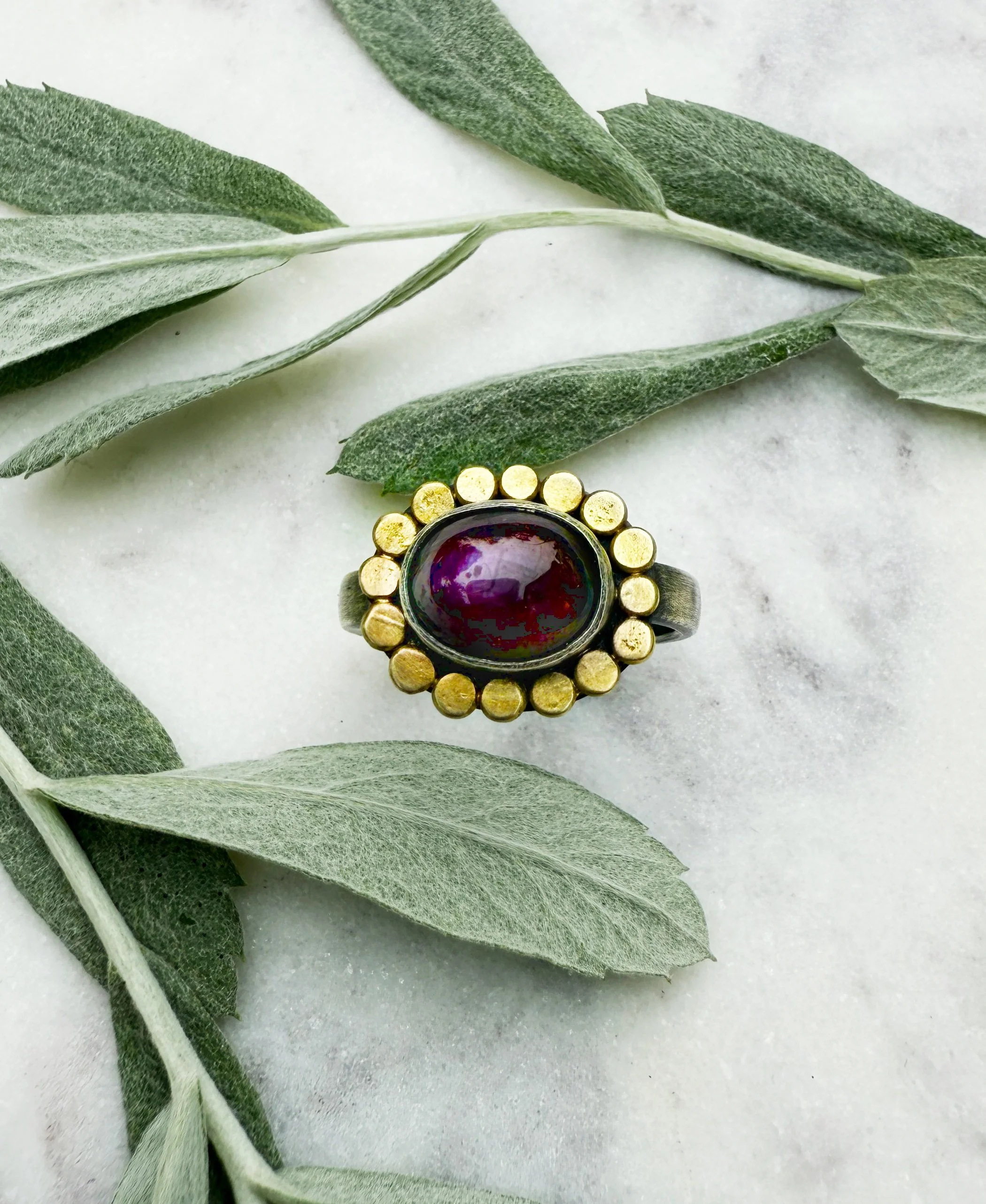 Sterling silver and 18k yellow gold ring with natural star ruby. Oxidized silver allows the warmth of the yellow gold to glow while surrounding a stunning 6-prong star sapphire. It’s difficult to capture, but in the sunshine is shines amazingly!