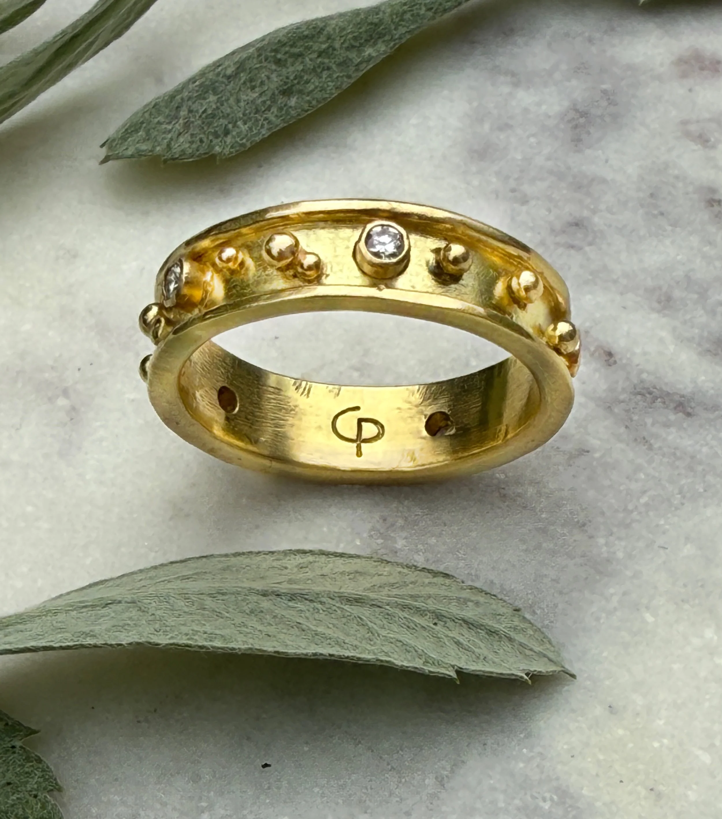 Crafted in glowing 18 royal yellow gold this band features 5 Round White Diamonds bezel set equally around the band. Detailed with hand crafted granulation details and gold borders. The soft textures of the metal and the sparkle of the diamonds make this unique band an everyday luxury.